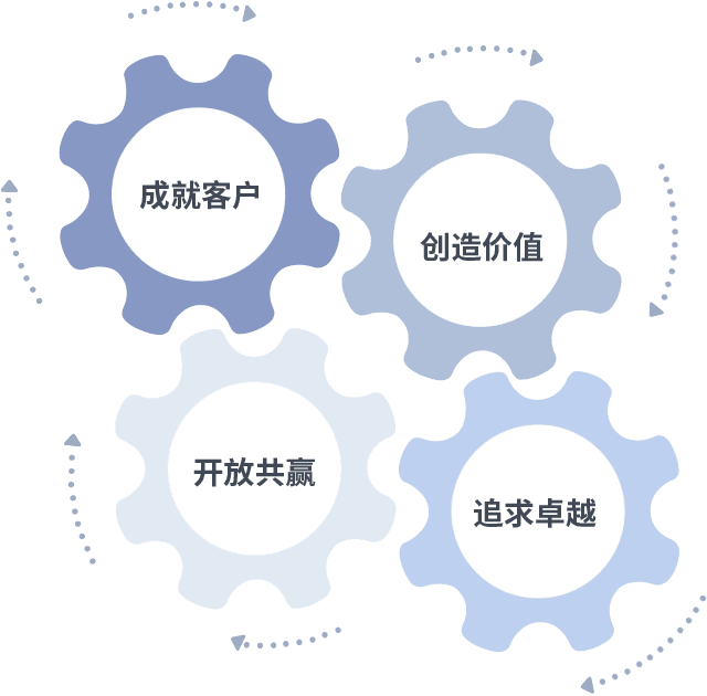 成就客户是一切决策的出发点,,,创造价值是衡量所有工作的标准,,,追求卓越是我们做事做人的态度,,,开放共赢是我们的格局也是最终的结果。。。价值观的齿轮环环相扣,,,推动着组织里的每个人不断向前。。